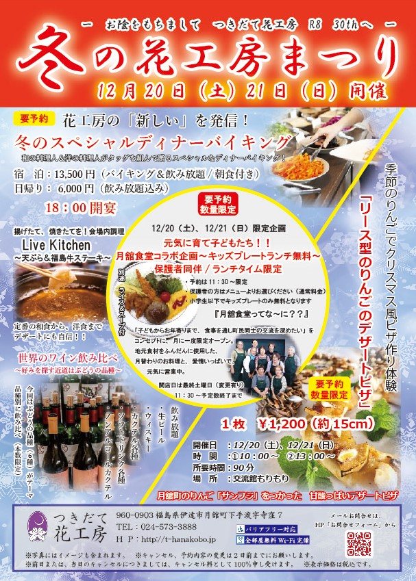 令和8年8月に創業30年を迎えるつきだて花工房では、12/20(土)、12/21(日)の2日間、「冬の花工房まつり」を開催します。地元の団体とコラボした、キッズプレート無料企画や、ディナーバイキング、リース型のりんごのデザートピザなど、お客様がわくわくするような企画を準備しました。