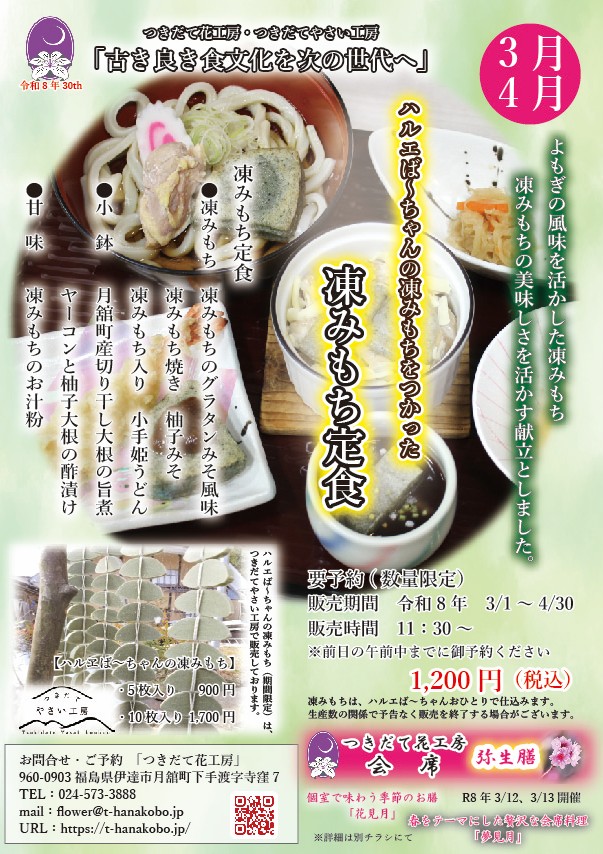 つきだて花工房では、毎年大変ご好評を頂いている、野菜の直売所「つきだてやさい工房」とのコラボ商品、ハルエば~ちゃんのよもぎ入り凍みもちを使った「凍みもち定食」を2026年3月1日より期間限定で販売しております。4年目を迎えた凍みもち定食は、昨年に引き続き「古き良き食文化を次の世代へ」をテーマに、郷土食「凍みもち」を主役に、様々な味が楽しめる献立となっております。昔から作られてきた保存食を「これからも伝えていきたい」という思いを込め、花工房がお勧めする食べ方なども取り入れました。