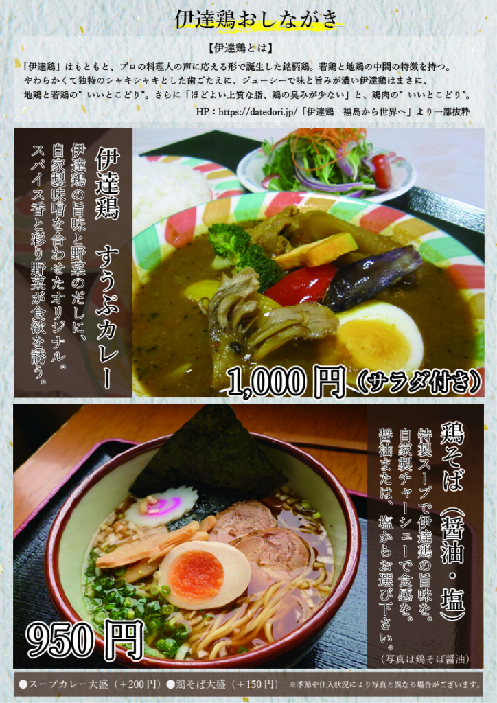 福島県の三大ブランド鶏の一つ、伊達鶏を使ったメニューが人気です。写真上は伊達鶏すうぷカレー、下はとりそば(支那そば)です。他に、自家製ブレンドの味噌ダレが大好評の味噌カツ丼をはじめ、各種定食や麺類などを取り揃えております。